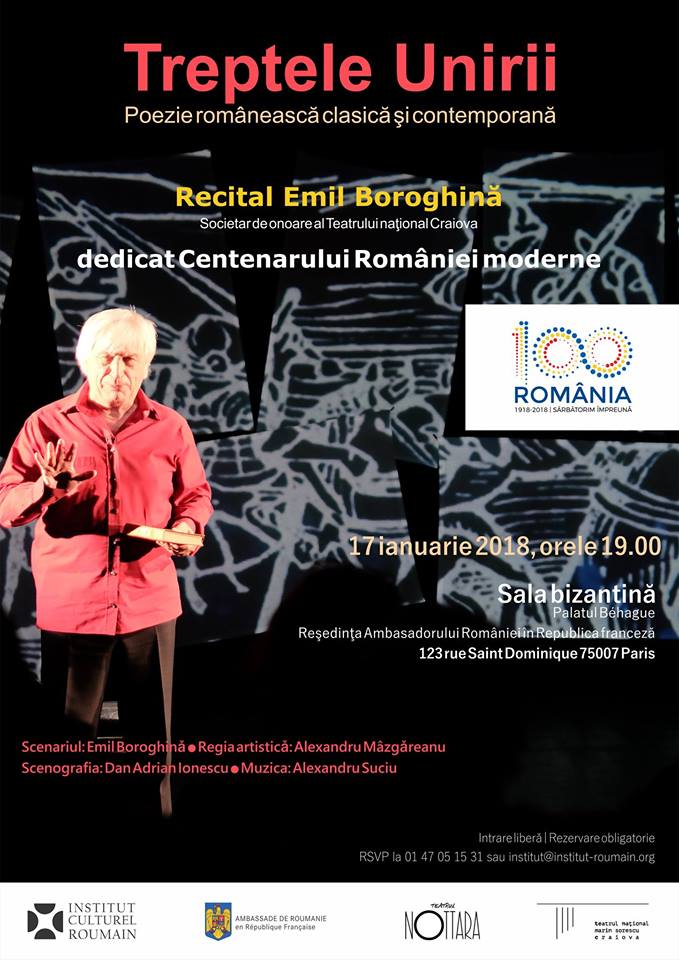 * ICR şi ICR Paris, în colaborare cu Ambasadele României în Regatul Belgiei şi în Regatul ţărilor de Jos şi al Ambasadei României la Paris, au lansat anul Centenarului Marii Uniri de la 1 decembrie 1918, prin spectacolul de poezie românească clasică şi contemporană, "Treptele Unirii", în interpretarea actorului Emil Boroghină. Proiectul a făcut parte din primul turneu european al spectacolului amintit, co-produs de Teatrul Nottara din Bucureşti şi Teatrul Naţional Marin Sorescu din Craiova, şi a inclus reprezentaţii la Paris, Bruxelles, Haga şi Viena în perioada 17-30 ianuarie.