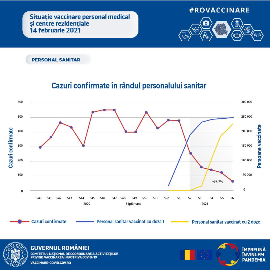 "Avem rezultate care confirmă de fapt un lucru extraordinar de important. Vorbim despre faptul că vaccinarea şi-a dovedit în România eficienţa şi siguranţa. Astfel că peste 90% din personalul medical a fost vaccinat şi cu cea de-a doua doză, iar dacă ne uităm pe datele pe care le avem, se constată o scădere cu peste 87% în ultimele patru săptămâni a infectărilor cu SARS-COV-2 în rândul personalului medical. Acest lucru spune că vaccinarea este sigură, că vaccinarea este eficientă şi că vaccinarea va opri pandemia. Sunt date care de altfel sunt ilustrate şi de către directorul OMS, care a făcut o declaraţie, menţionând faptul că la nivel mondial rata infectărilor a scăzut în ultimele câteva săptămâni, fiind practic la jumătate faţă de cea de la începutul anului. Sigur, contribuie în principal măsurile de protecţie - purtarea măştii, păstrarea distanţei, o igienă mai riguroasă, însă şi vaccinarea are un rol important cu cele peste 150.000.000 de doze administrate", a afirmat Baciu.