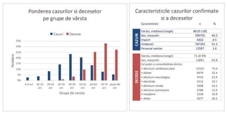 Până la 14 martie 2021, din totalul deceselor analizate, vârsta medie a persoanelor decedate era de 71 de ani, 59,8% (12.891 persoane) fiind de sex masculin. De asemenea, 95,3% dintre persoanele decedate aveau cel puţin o comorbiditate: afecţiuni cardiovasculare (72% - 15.525 persoane), diabet (32,4% - 6.979 de persoane), afecţiuni neurologice (21,9% - 4.713 persoane), obezitate (19,1% - 4.112 de persoane), afecţiuni renale (16,3% - 3.508 persoane), afecţiuni pulmonare (12,9% - 2.788 de persoane), neoplasm (10,8% - 2.328 de persoane), altele (20,3% - 4.377 de persoane), relevă Raportul CNSCBT.