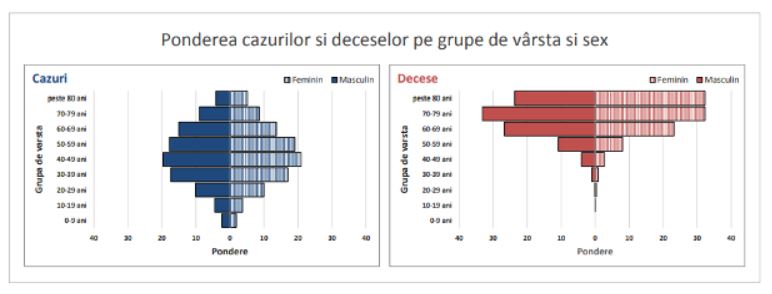 Referitor la ponderea deceselor pe grupe de vârstă şi sex, se observă, la 14 martie 2021, că cea mai mare pondere a deceselor la femei era la grupele de vârstă 70-79 ani şi peste 80 de ani (aproximativ 34%); următoarea categorie cea mai afectată la femei era grupa de vârstă 60-69 de ani (aproximativ 24%). Şi la bărbaţi, grupa de vârstă 70-79 ani era cea mai afectată, cu un procent de mortalitate de 34%; următoarele grupe de vârstă cele mai afectate, la bărbaţi, erau 60-69 de ani (aproximativ 26%) şi peste 80 de ani (aproximativ 24%), conform www.cnscbt.ro. Se observă, astfel, o diferenţă între bărbaţi şi femei la categoria de vârstă peste 80 de ani, femeile înregistrând o mortalitate de 34%, în timp ce bărbaţii un procent de 24%.