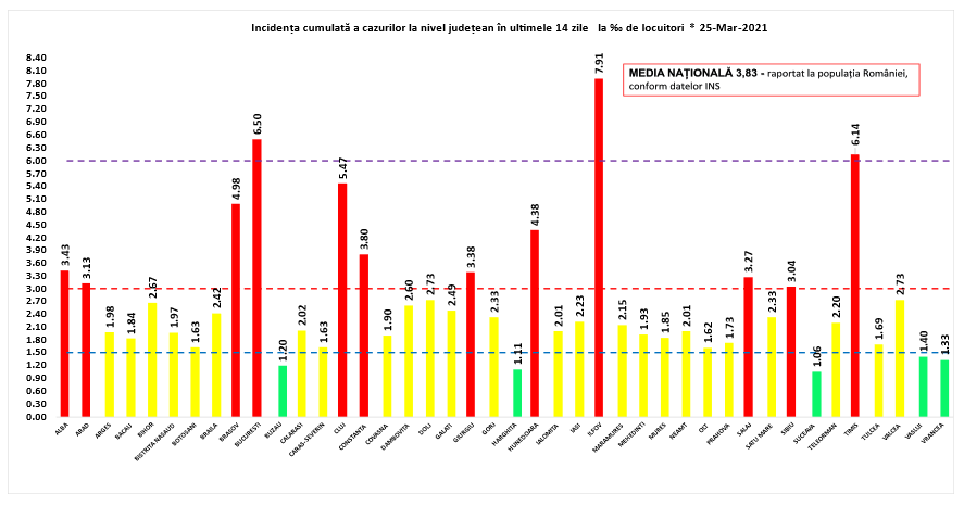 Rate mari de infectare sunt şi în judeţele Timiş - 6,14, Cluj - 5,47, Braşov - 4,98, Hunedoara - 4,38, Constanţa - 3,80, Sălaj - 3,72, Alba - 3,43, Giurgiu - 3,38, Arad - 3,13, Sibiu - 3,04.