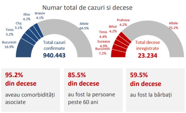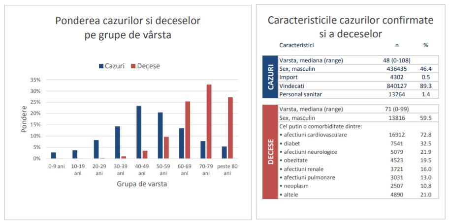 Până la 28 martie 2021, din totalul deceselor analizate, vârsta medie a persoanelor decedate era de 71 de ani, 59,5% (13.816 persoane) fiind de sex masculin. De asemenea, 95,3% dintre persoanele decedate aveau cel puţin o comorbiditate: afecţiuni cardiovasculare (72,8% - 16.912 persoane), diabet (32,5% - 7.541 de persoane), afecţiuni neurologice (21,9% - 5.079 persoane), obezitate (19,5% - 4.523 de persoane), afecţiuni renale (16% - 3.721 persoane), afecţiuni pulmonare (13% - 3.031 de persoane), neoplasm (10,8% - 2.507 de persoane), altele (21% - 4.890 de persoane), relevă Raportul CNSCBT.