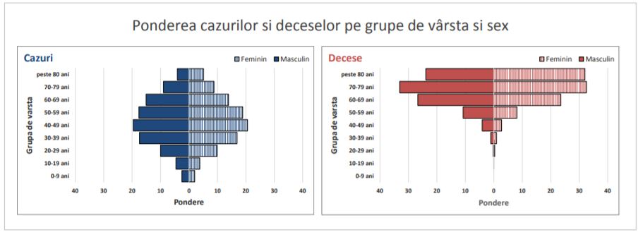 Referitor la ponderea deceselor pe grupe de vârstă şi sex, se observă, la 28 martie 2021, că cea mai mare pondere a deceselor la femei era la grupele de vârstă 70-79 ani şi peste 80 de ani (aproximativ 34%); următoarea categorie cea mai afectată la femei era grupa de vârstă 60-69 de ani (aproximativ 24%). Şi la bărbaţi, grupa de vârstă 70-79 ani era cea mai afectată, cu un procent de mortalitate de 34%; următoarele grupe de vârstă cele mai afectate, la bărbaţi, erau 60-69 de ani (aproximativ 27%) şi peste 80 de ani (aproximativ 24%), conform www.cnscbt.ro. Se observă, astfel, o diferenţă între bărbaţi şi femei la categoria de vârstă peste 80 de ani, femeile înregistrând o mortalitate de 34%, în timp ce bărbaţii un procent de 24%.