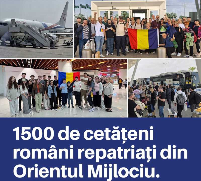 Peste 1.500 de cetățeni români au revenit în țară în siguranță din statele afectate de conflictul din Orientul Mijlociu, prin zboruri de evacuare, repatriere asistată sau facilitate de MAE, informează duminică seara Ministerul Afacerilor Externe. De asemenea, MAE estimează că alți circa 1.000 de cetățeni români au ieșit