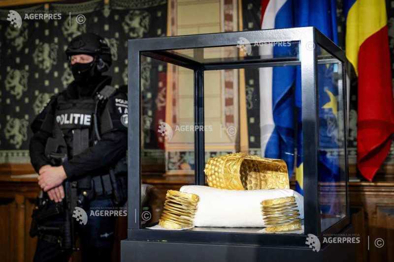 Coiful de la Coțofenești și două dintre cele trei brățări dacice de aur au fost predate autorităților române, joi, la sediul Muzeului Drents din Țările de Jos. Foto: (c) SEM VAN DER WAL / EPA Potrivit unui comun