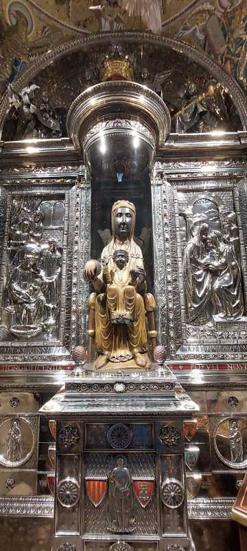 Actuala biserică, reconstruită după distrugerile provocate de trupele lui Napoleon, impresionează prin vitralii fine și prin cele 160 de candele din argint, fiecare cu un model diferit. Tot tradiția spune că cei care se roagă La Moreneta trebuie să înceapă cu o rugăciune pentru pacea lumii. 'Este prima rugă. După aceea fiecare ce mai are pe suflet', explică ghidul. Și noi ne-am așteptat rândul și am făcut același lucru.