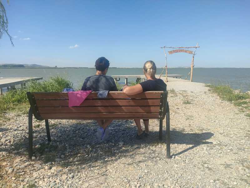 În lacul Razim, sunt câțiva copii care se joacă, supravegheați de două mame care stau pe o bancă și vorbesc.