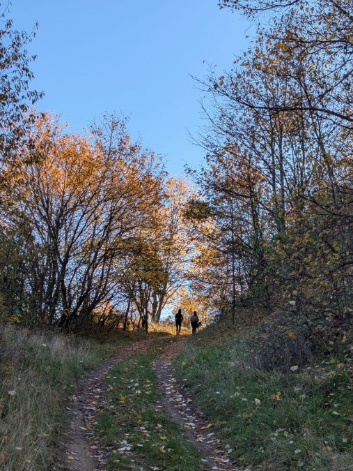 La câteva minute după ora stabilită pentru întâlnire, grupul strâns în jurul Ancăi pornește pe drumul către pădure. Casele orașului rămân repede în urmă, în timp ce, în față, se deschide un drum forestier care șerpuiește printre arborii înveliți în frunzișul pastelat al toamnei.