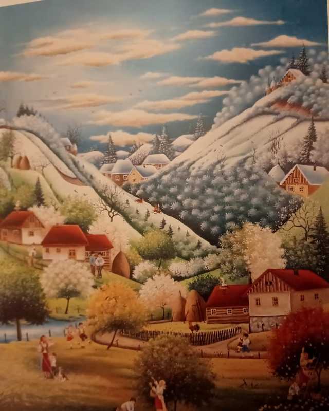Tabloul 'Ciclul anotimpurilor' atrage privirile prin melanjul perfect între iarna îndepărtată, care coboară de pe dealuri în pași de primăvară și vară și care se topesc în vatra satului, în îmbelșugata toamnă.