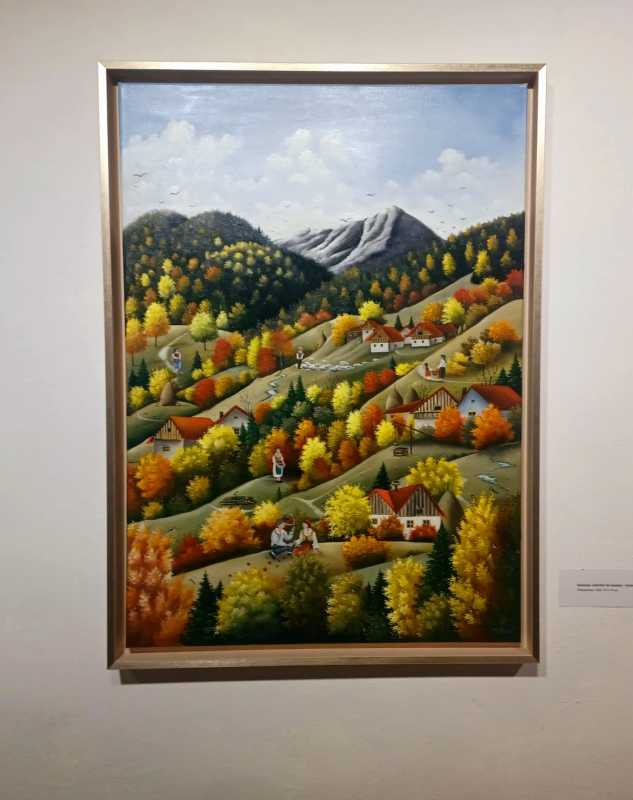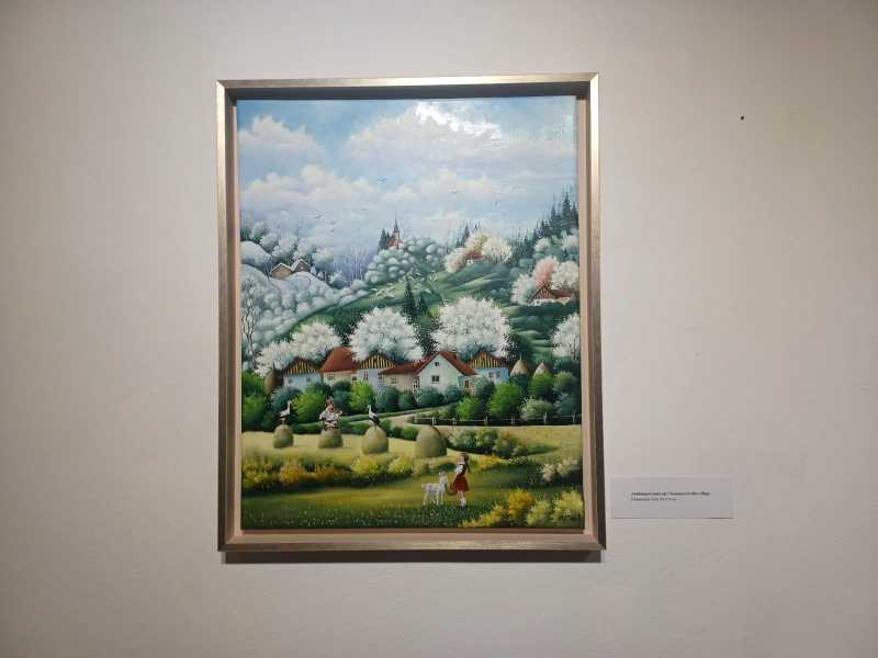 Odată cu primul pas în galerie, am intrat într-o lume a tot ce poate fi mai pur, mai senin: lumea satului românesc, cu copii fericiți, oameni veseli, tineri care își leagă în logodne jurămintele de iubire, la seceriș, colindatul de Crăciun sau bucuria așteptării Învierii, cu biserici care patronează satele, din vârful dealurilor, până la care ajungi cu anevoie, pe cărări care se pierd, întotdeauna, în cerul atât de aproape, din pictura naivă.