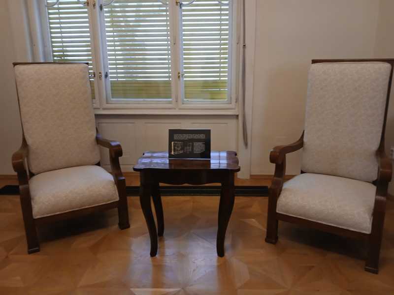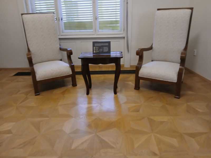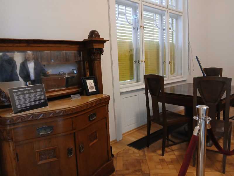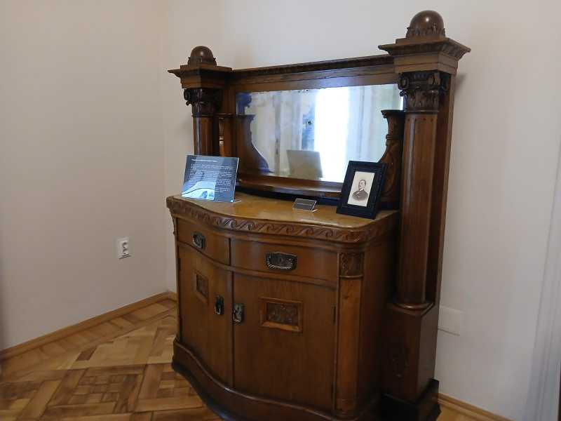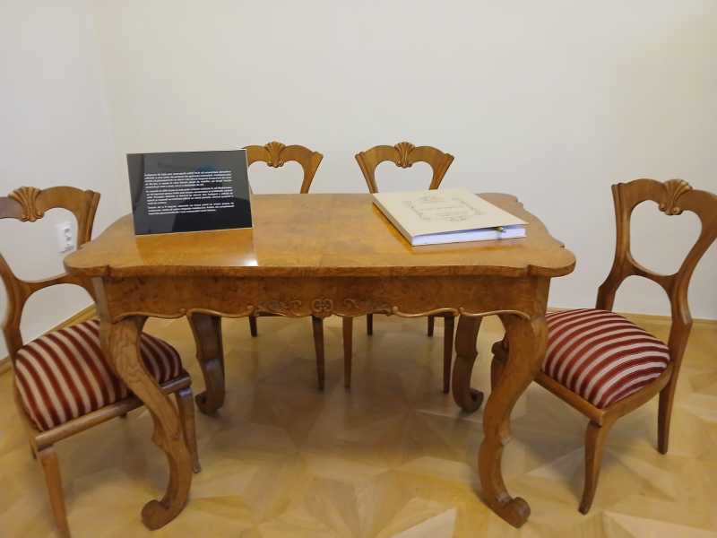 Este vorba despre un mobilier alcătuit din bufet mare din stejar, decorat cu motive florale și geometrice sculptate, vitrina bufetului ale cărei uși sunt prevăzute cu 16 cristale șlefuite, un bufet mic din stejar, de asemenea decorat cu motive florale și geometrice sculptate. Mai poate fi văzută o masă triplu extensibilă din stejar masiv, decorată cu motive florale sculptate, ce datează din 1908, și un set de 4 scaune din stejar, tapisate cu piele și ornamentate cu detalii florale sculptate.
