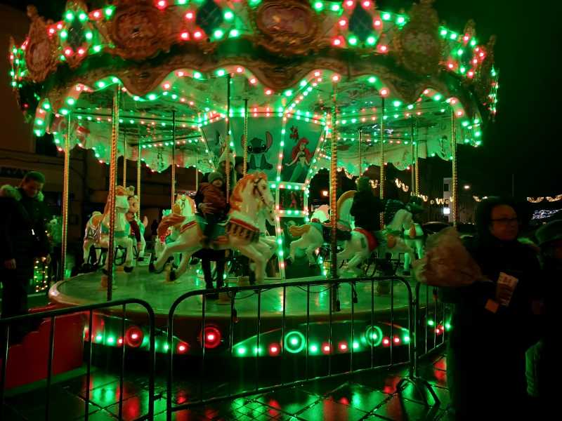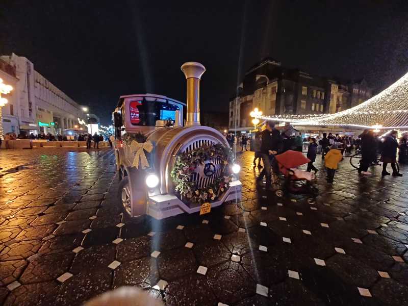 Și în stația unde ajunge trenulețul Moșului este aglomerație ca în Gara de Nord, se urcă civilizat, copiii vor la geam, cu părinții alături, apoi trenulețul intră în Piața Operei/Victoriei, inundată în sute de mii de luminițe care se revarsă în cascade colorate.