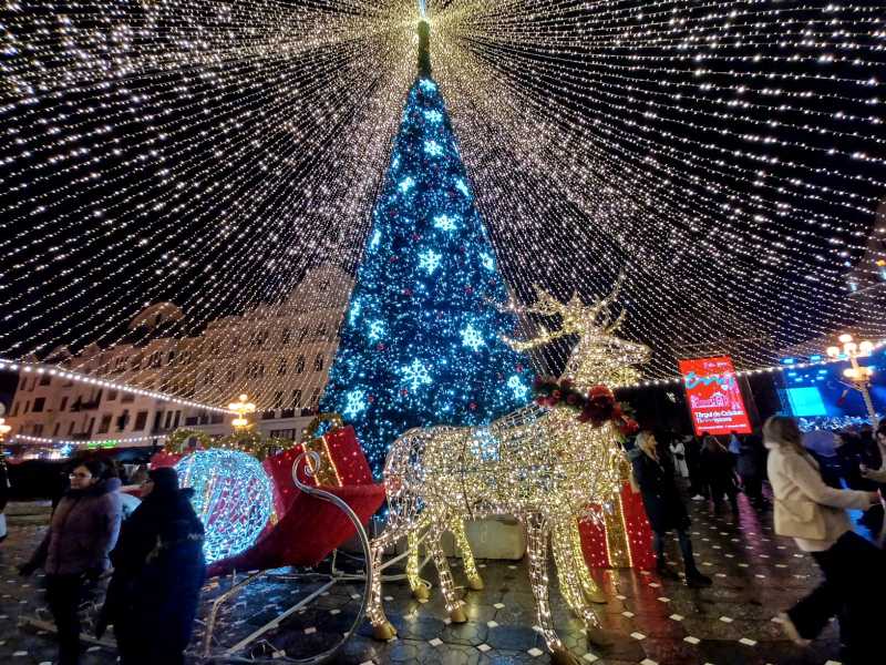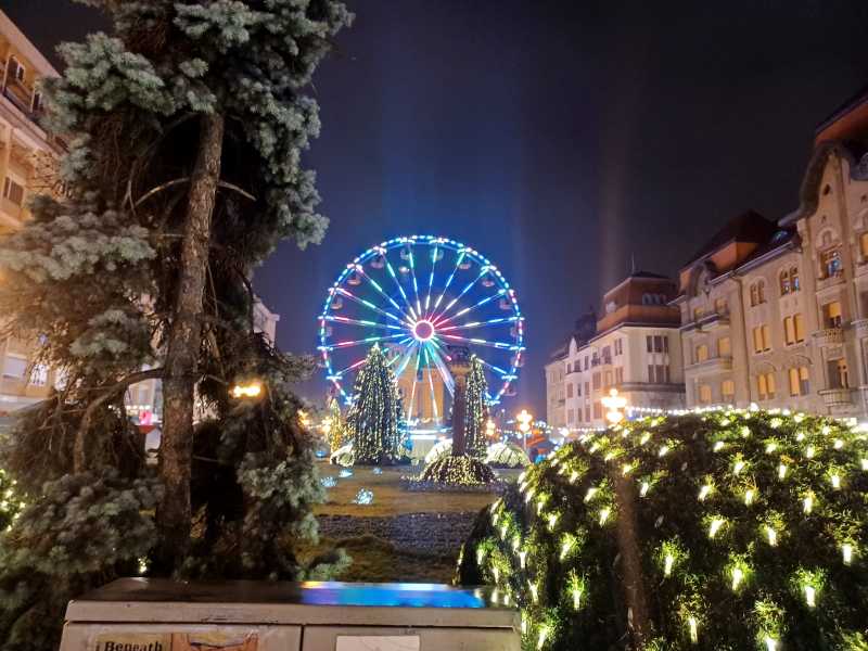 Și în Piața Operei sunt atracții ca în mai toate capitalele europene: un trenuleț auriu pentru copii, zeci de căsuțe care vând tot ce vrei, ca în târgurile de la Viena, roata uriașă ca la Paris, caruseluri și călușei ca la Munchen, iar în Piața Libertății a fost instalat un brad-ringhișpil ca la Metz.
