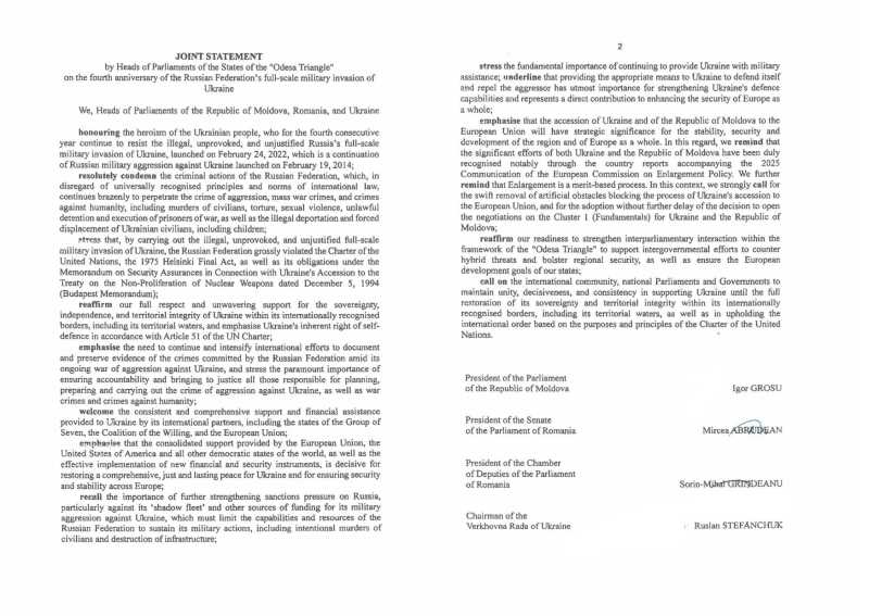 Conform sursei citate, declarația comună a șefilor de parlamente din cadrul 'Triunghiului Odesa' condamnă ferm acțiunile criminale ale Federației Ruse, care, cu nesocotirea principiilor și normelor universal recunoscute ale dreptului internațional, continuă să comită acțiuni de agresiune, crime de război și crime împotriva umanității.