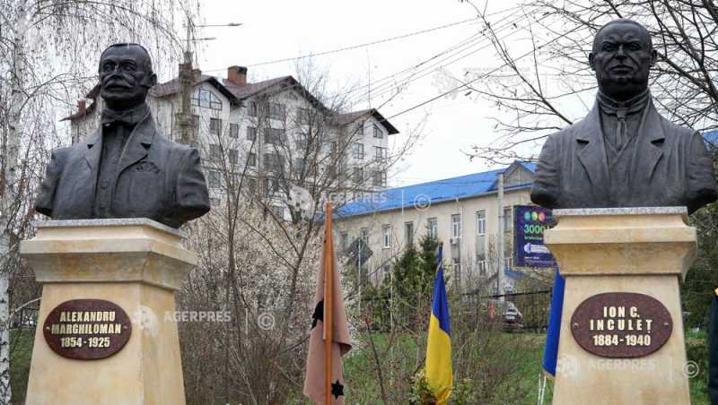 Ceremonia de dezvelire a busturilor lui Alexandru Marghiloman şi Ion Inculeţ, amplasate in Parcul 'Sfatul Ţării' din municipiul Ialoveni, Republica Moldova, eveniment prilejuit de implinirea a 105 ani de la Unirea Basarabiei cu Romania.