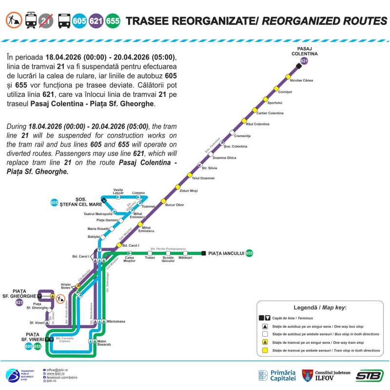 Circulația tramvaielor liniei 21 va fi suspendată în zilele de sâmbătă, 18 aprilie, și duminică, 19 aprilie, în timp ce liniile de autobuz 605, 655 și N103 vor funcționa pe trasee modificate, pentru a permite executarea unor lucrări de intervenție la macazul amplasat la intersecția Calea Moșilor/Str. Lipscani/Str. Cavafii Vechi