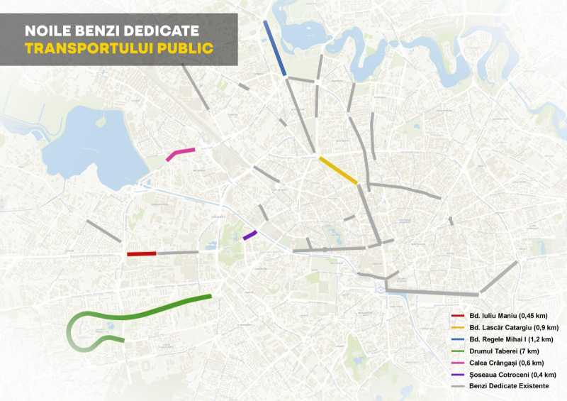 El a scris, marți, pe Facebook, că noile benzi vor fi amenajate pe următoarele trasee: Bd. Lascăr Catargiu (între Piața Victoriei și Piața Romană, sens spre Romană) - 0,9 kilometri, Șos. Cotroceni (între str. Prof. Dr. Gh. Marinescu și Splaiul Independenței, pe ambele sensuri) - 0,4 kilometri, Bd. Iuliu Maniu (între str. Lujerului și Liceul Tudor Vladimirescu, sens spre centru) - 0,45 kilometri, Bd. Regele Mihai I al României (zona centrală, sens spre Piața Presei) - 1,2 kilometri, Calea Crângași (între str. Gen. Petre Popovăț și Pasajul Grant, sens spre pasaj) - 0,6 kilometri, Drumul Taberei, pe ambele sensuri - 7 kilometri (3,5 kilometri pe sens).