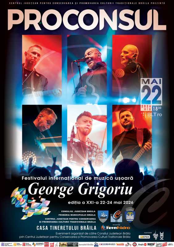 Proconsul, Monica Anghel și The Motans vor susține recitaluri în cadrul ediției de anul acesta a Festivalului Internațional de Muzică Ușoară 'George Grigoriu', informează Centrul Județean pentru Conservarea și Promovarea Culturii Tradiționale (CJCPCT) Brăila. Festivalul Internațional de Muzică Ușoară 'George Grigoriu', si