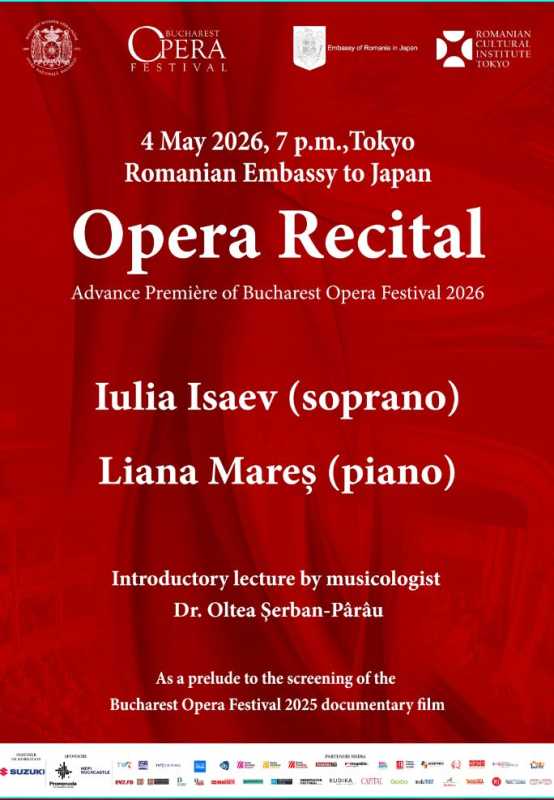 Un recital extraordinar susținut de soprana Iulia Isaev și pianista Liana Mareș, dedicat promovării excelenței artei lirice românești în fața publicului japonez, va avea loc pe 4 mai, la Tokyo. Evenimentul, care anticipează ediția din 2026 a Bucharest Opera Festival, este organizat de Institutul Cultural Român de la Tokyo și