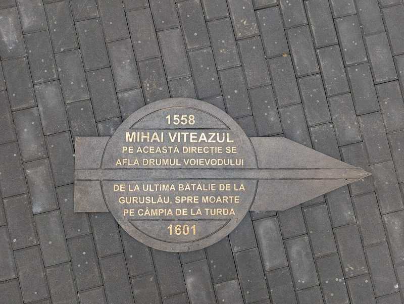 Semnificația amplasamentului este detaliată pe o placă de bronz, montată pe sol lângă statuie, pe care se poate citi: 1558 - Mihai Viteazul - pe această direcție se află drumul voievodului de la ultima bătălie de la Guruslău, spre moarte pe câmpia de la Turda - 1601.