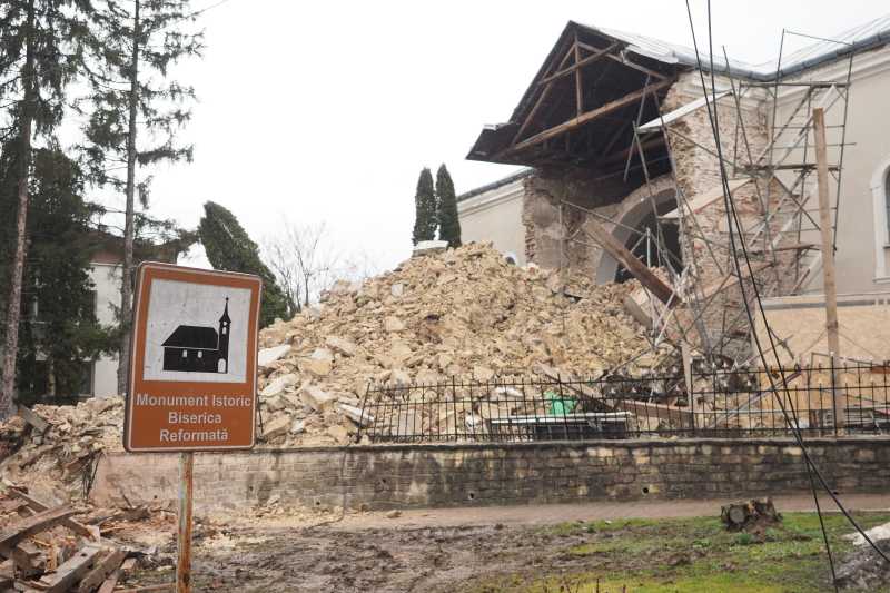 La Biserica Reformată din orașul Cehu Silvaniei, județul Sălaj, monument istoric de grupă valorică A, s-a produs, marți seară, o prăbușire parțială a clădirii, pe trotuar și pe o parte a carosabilului.