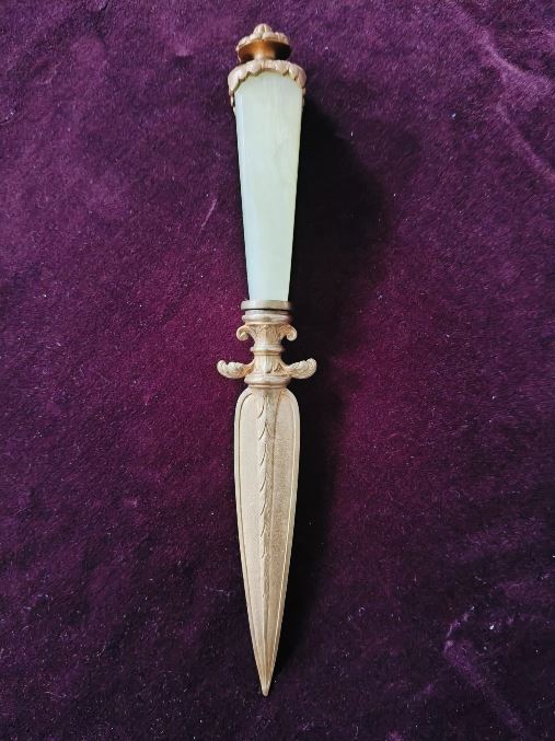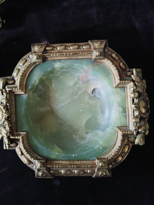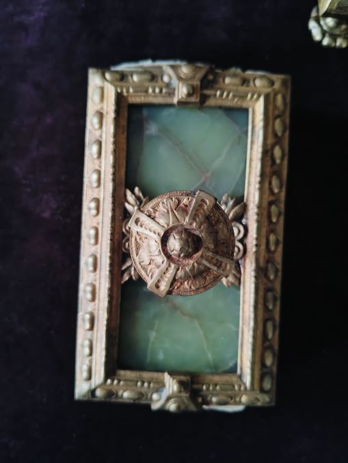 Obiectele ies din sfera simplului instrumentar de scris, fiind lucrate minuțios, cu detalii ornamentale - flori stilizate, motive geometrice - și denotă un gust cultivat, atent la stil și eleganță. Piesele impresionează nu doar prin materiale - bronz și onix verde - ci și prin rafinamentul execuției și coerența compozițională a setului.