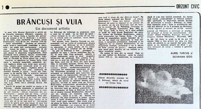 Totodată, mai arată acesta, sub egida Muzeului Banatului din Timișoara, la editura Mirton, în anul 2008, apare 'Traian Vuia. 1872-1950', studiu monografic și catalog, scris de Elena Boruga, în care se amintește din nou despre sculptura lui Brâncuși, care face parte din Colecția Memoriale a Muzeului Banatului.