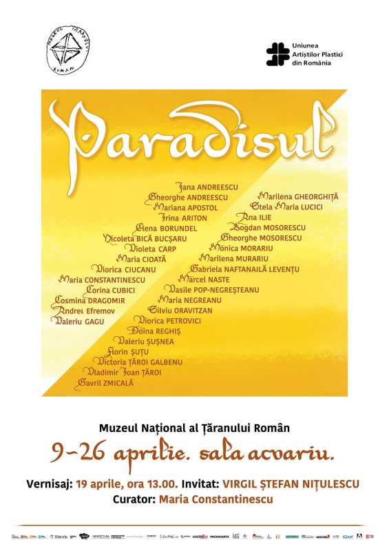 Expoziția colectivă de artă 'Paradisul', care reunește lucrările unui număr impresionant de artiști contemporani români, va putea fi vizitată în perioada 9-26 aprilie la Sala Acvariu a Muzeului Național al Țăranului Român. Vernisajul expoziției va avea loc duminică, 19 aprilie, la ora 13:00, în prezența manageru