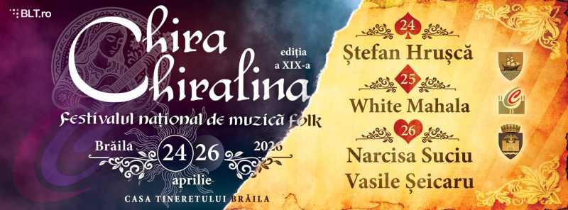 Ștefan Hrușcă, Narcisa Suciu și Vasile Șeicaru vor susține recitaluri în cadrul celei de-a XIX-a ediții a Festivalului Național de Muzică Folk 'Chira Chiralina', care se desfășoară la Brăila în perioada 24-26 aprilie, informează Centrul Județean pentru Conservarea și Promovarea Culturii Tradiționale Brăila: