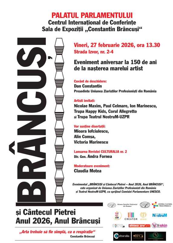 Evenimentul aniversar 'Brâncuși și Cântecul Pietrei - Anul 2026, Anul Brâncuși', dedicat celebrării a 150 de ani de la nașterea marelui sculptor român, va avea loc, vineri, la ora 13:30, în Sala de expoziții 'Constantin Brâncuși' din Palatul Parlamentului - Centrul Internațional de Conferințe.