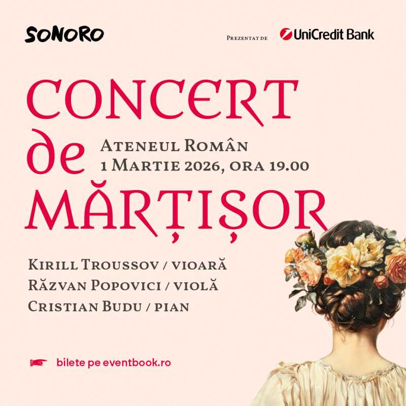 Concertul de Mărțișor SoNoRo, care reunește unele dintre cele mai frumoase partituri semnate de Beethoven, Wieniawski, Sarasate, Halvorsen, Glinka, Weber și Șostakovici, va avea loc duminică, 1 martie, la Ateneul Român. Potrivit unui comunicat transmis marți AGERPRES, aflat la cea de-a VII-a ediție, concertul, programat de la ora 19:00,