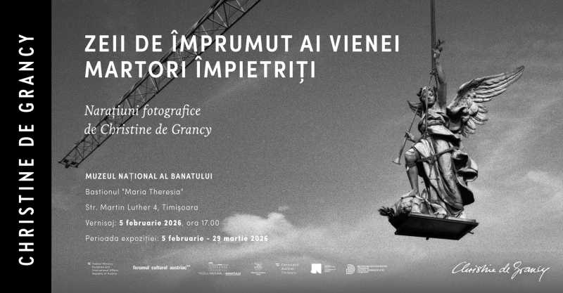 Expoziția-eveniment de fotografie,'Zeii de împrumut ai Vienei. Martori împietriți', semnată de Christine de Grancy, fotograf de teatru și artă, va fi vernisată, joi, de la ora 17:00, la Muzeul Național al Banatului (MNB) din Timișoara, supranumită 'Mica Vienă', invitând la o călătorie, la pas, pe acoperișurile palatelor și clădirilor