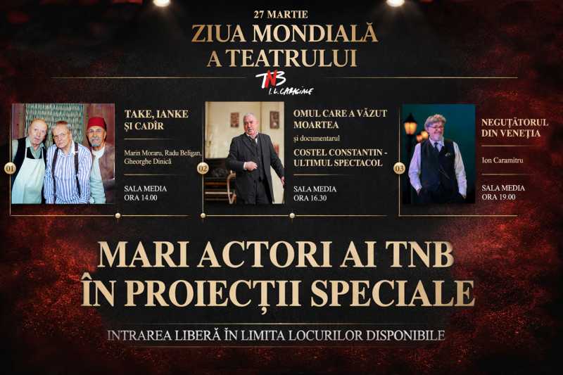 Teatrul Național 'I.L. Caragiale' din București invită publicul pe 27 martie, de Ziua Mondială a Teatrului, la evenimentul special 'Mari actori ai TNB în proiecții speciale'. Evenimentul va avea loc la Sala Media, începând cu ora 14:00, iar accesul este gratuit, în limita locurilor disponibile. Potrivit pa