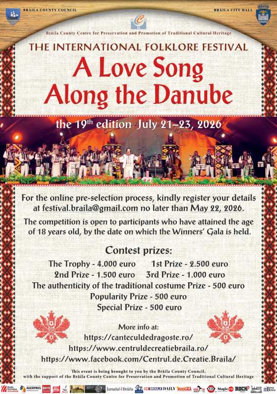 Înscrierile la Festivalul internațional de folclor 'Cântecul de dragoste de-a lungul Dunării' de la Brăila, concurs care va avea loc în luna iulie și se adresează artiștilor din țările aflate pe cursul Dunării, se vor încheia pe 22 mai, au informat, vineri, reprezentanții Centrului Județean pentru Conservarea și Promovarea Culturii Tradițional
