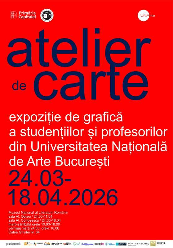 O expoziție de grafică a studenților și profesorilor din cadrul Universității Naționale de Arte București - 'Atelier de carte' - va fi găzduită, începând de săptămâna viitoare, la sediul din Calea Griviței al Muzeului Național al Literaturii Române (MNLR). Expoziția, care va fi vernisată pe 24 martie, de la ora