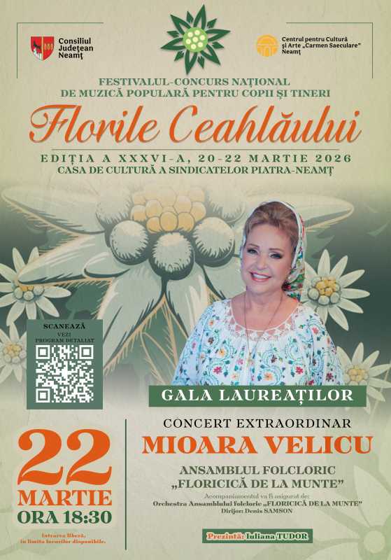 Ediția din acest an a Festivalului-concurs național de muzică populară pentru copii și tineri 'Florile Ceahlăului', la care în urma preselecției naționale participă 82 de finaliști, debutează vineri, la Piatra-Neamț. Concursul, ajuns la ediția cu numărul 36, se desfășoară pe două secțiuni, respectiv canto tradițional și instrumente, ambele p