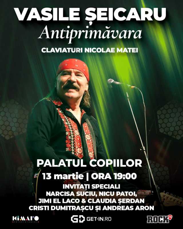 Cantautorul Vasile Șeicaru aduce, vineri, la Palatul Național al Copiilor, de la ora 19:00, spectacolul 'Antiprimăvara', o incursiune în discografia sa. Potrivit site-ului iabilet.ro, artistul revine pe scenă cu un spectacol emoționant, construit în jurul celor mai cunoscute și îndrăgite compoziții ale sale, dar și cu