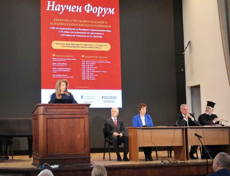 Un forum științific care marchează trei aniversări-cheie din istoria Bulgariei a fost deschis oficial miercuri la Academia Bulgară de Științe (BAS) din Sofia. Evenimentul comemorează 1160 de ani de la creștinarea poporului bulgar, 1170 de ani de la crearea alfabetului glagolitic și 1140 de ani de la moartea Sfântului Metodie. Vicepreședinta Iliana Iotova, care patronea