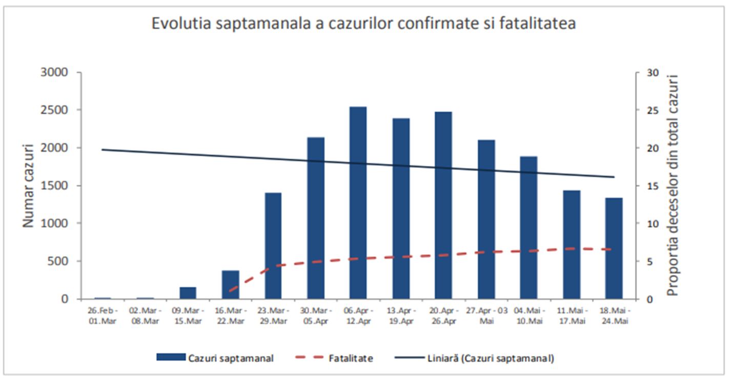 Analiza cazurilor de COVID-19 pe săptămâni evidenţiază că în săptămâna 18-24 mai 2020 s-a înregistrat cea mai mică creştere a numărului de îmbolnăviri noi de la o săptămână la alta din ultimele nouă săptămâni. Nivelul creşterii în această ultimă săptămână este mai mic decât în săptămâna 23-29 martie. Vârful creşterii cazurilor noi de la o săptămână la alta a fost înregistrat, în România, în intervalul 6-12 aprilie 2020, potrivit raportului.