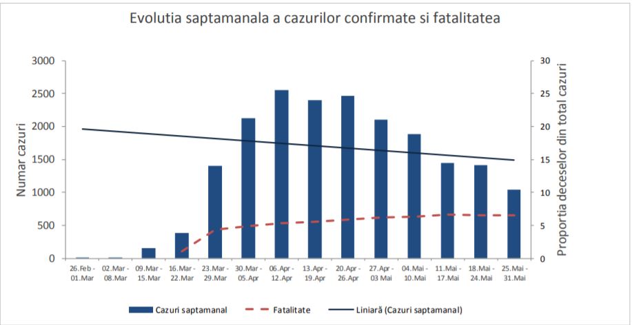 Analiza cazurilor de COVID-19 pe săptămâni evidenţiază că în săptămâna 25-31 mai 2020 s-a înregistrat cea mai mică creştere a numărului de îmbolnăviri noi de la o săptămână la alta din ultimele 10 săptămâni. Nivelul creşterii în această ultimă săptămână este mai mic decât în săptămâna 23-29 martie. Vârful creşterii cazurilor noi de la o săptămână la alta a fost înregistrat, în România, în intervalul 6-12 aprilie 2020, potrivit raportului.