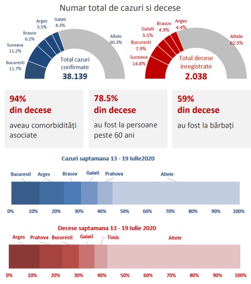 Centrul Naţional de Supraveghere şi Control al Bolilor Transmisibile (CNSCBT) a publicat, la 21 iulie 2020, Raportul săptămânal de supraveghere COVID-19 actualizat cu intervalul 13-19 iulie 2020. Astfel, până la 19 iulie 2020, 94% dintre decese aveau comorbidităţi asociate, 78,5% erau înregistrate la persoane de peste 60 de ani, iar 59% dintre decese erau întâlnite la bărbaţi. De asemenea, în săptămâna 13-19 aprilie 20120 s-a înregistrat cea mai mare creştere săptămânală a numărului de cazuri de la debutul epidemiei în România, conform site-ului cnscbt.ro, www.cnscbt.ro.