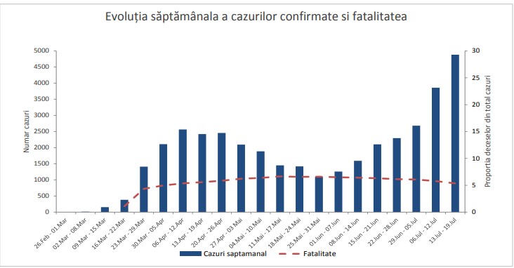 Analiza cazurilor de COVID-19 pe săptămâni evidenţiază că în intervalul 13-19 iulie 2020 s-a înregistrat cea mai mare creştere de când a început epidemia în ţara noastră, între 4.500 şi 5.000 de infectări săptămânal. Cel mai mare vârf al numărului de infectări a fost înregistrat în intervalul 13-19 aprilie 2020, conform raportului.