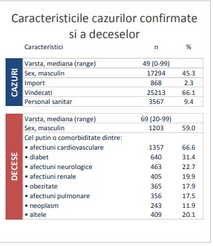 Dintre cele 38.139 de cazuri analizate până la 19 iulie, 45,3% (17.294 persoane) erau de sex masculin, 2,3% erau cazuri de import (868), iar 9,4% (3.567 de persoane) erau reprezentate de personal medical. Vârsta medie a persoanelor infectate cu COVID-19 era, până la data menţionată, de 49 de ani, mai informează raportul. Numărul de persoane vindecate era, la data analizei, de 66,1% (25.213 persoane).