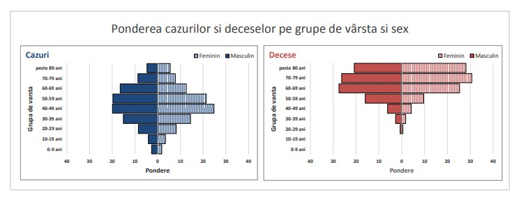 În ceea ce priveşte ponderea îmbolnăvirilor pe grupe de vârstă şi sex, se observă că, atât la femei cât şi la bărbaţi, cele mai afectate grupe de vârstă sunt 40-49 ani (25% la femei şi aproape 20% la bărbaţi) şi 50-59 ani (22% la femei şi 20% la bărbaţi). Situaţia până la 19 iulie a rămas aproximativ aceeaşi ca la analizele din ultimele 6 săptămâni în privinţa grupelor de vârstă şi sex.