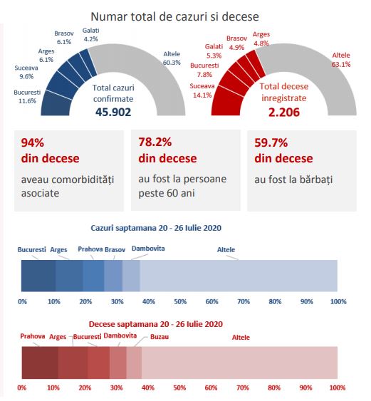 Raportul săptămânal al CNSCBT cuprinde statistici COVID-19 actualizate până la 26 iulie 2020 cu privire la ponderea cazurilor şi a deceselor pe grupe de vârstă, ponderea îmbolnăvirilor pe judeţe, caracteristicile cazurilor confirmate şi ale deceselor în funcţie de sex, vârstă, comorbidităţi etc. Analiza este realizată în baza a 45.902 cazuri confirmate şi 2.206 decese până la 26 iulie 2020.
