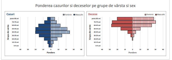În ceea ce priveşte ponderea îmbolnăvirilor pe grupe de vârstă şi sex, se observă că, atât la femei cât şi la bărbaţi, cele mai afectate grupe de vârstă sunt 40-49 ani (25% la femei şi aproape 20% la bărbaţi) şi 50-59 ani (22% la femei şi 20% la bărbaţi). Situaţia până la 26 iulie a rămas aproximativ aceeaşi ca la analizele din ultimele 7 săptămâni în privinţa grupelor de vârstă şi sex.