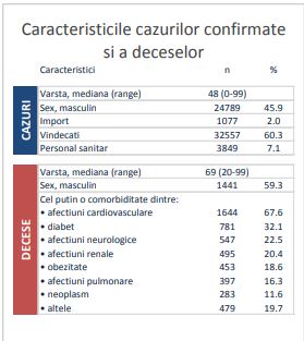 Dintre cele 54.009 cazuri analizate până la 2 august, 45,9% (24.789 persoane) erau de sex masculin, 2% erau cazuri de import (1077), iar 7,1% (3.849) erau reprezentate de personal medical. Vârsta medie a persoanelor infectate cu COVID-19 era, până la data menţionată, de 48 de ani, mai informează raportul. Numărul de persoane vindecate era, la data analizei, de 60,3% (32.557 persoane).