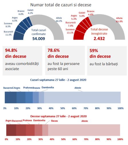 În ceea ce priveşte cazurile confirmate pe judeţe, în săptămâna 27 iulie - 2 august 2020, 33,9% din totalul cazurilor s-au înregistrat în Bucureşti, Argeş, Prahova, Braşov şi Dâmboviţa. De asemenea, 36,8% din totalul deceselor au fost înregistrate în Argeş, Bucureşti, Prahova, Dâmboviţa şi Bacău.
