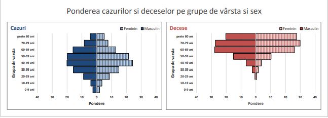 În ceea ce priveşte ponderea îmbolnăvirilor pe grupe de vârstă şi sex, se observă că, atât la femei cât şi la bărbaţi, cele mai afectate grupe de vârstă sunt 40-49 ani (25% la femei şi aproape 20% la bărbaţi) şi 50-59 ani (22% la femei şi 20% la bărbaţi). Situaţia până la 2 august a rămas aproximativ aceeaşi ca la analizele din ultimele şapte săptămâni în privinţa grupelor de vârstă şi sex.