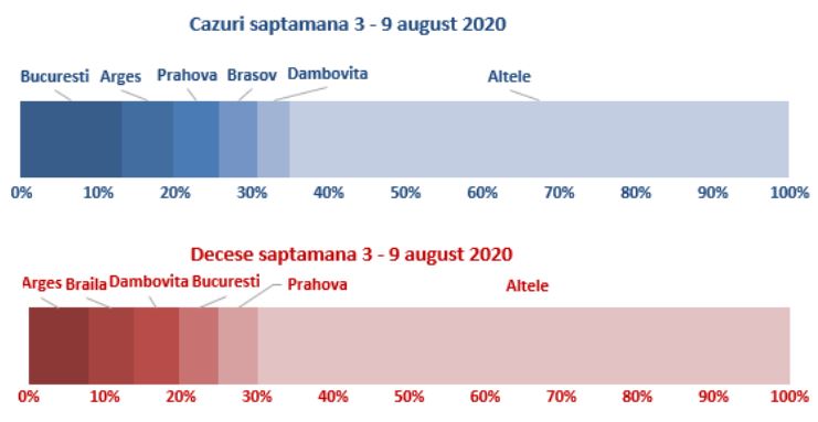 În ceea ce priveşte cazurile confirmate pe judeţe, în săptămâna 3 - 9 august 2020, 35,1% din totalul cazurilor s-au înregistrat în Bucureşti, Argeş, Prahova, Braşov şi Dâmboviţa. De asemenea, 30% din totalul deceselor au fost înregistrate în Argeş, Brăila, Dâmboviţa, Bucureşti şi Prahova.